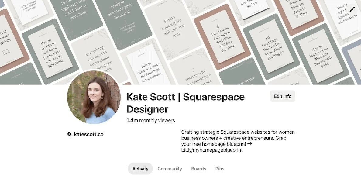 Pinterest is a search engine, like Google, and it’s important to use keywords if you want to be found. (We’ll be talking more about this as we go along.) Your display name should contain your company’s name but don’t stop there. Add a keyword or two to make your profile more discoverable. For example, my display name is Kate Scott | Squarespace Designer.