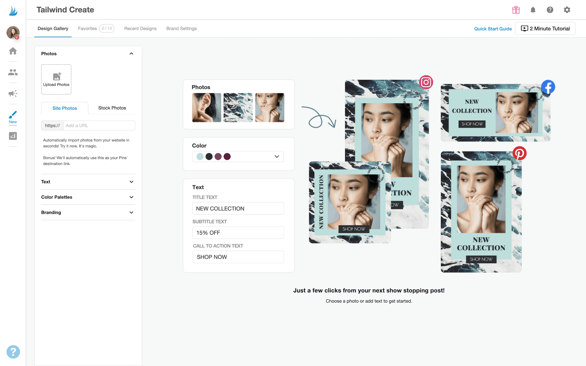 All you have to do is upload a photo, add your text, and choose a color palette. Unfortunately, you can’t add your own brand colors but you can choose from an extensive list of pre-designed color palettes or use a color palette pulled from the photo you uploaded.