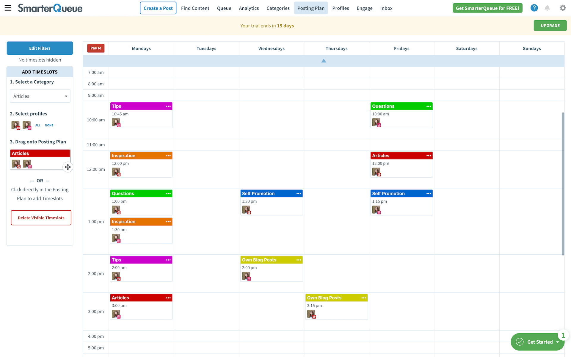 Once you’ve created your categories, you can make a posting plan. This tells SmarterQueue what types of posts should be published each day. Here’s an example of what your posting plan could look like.