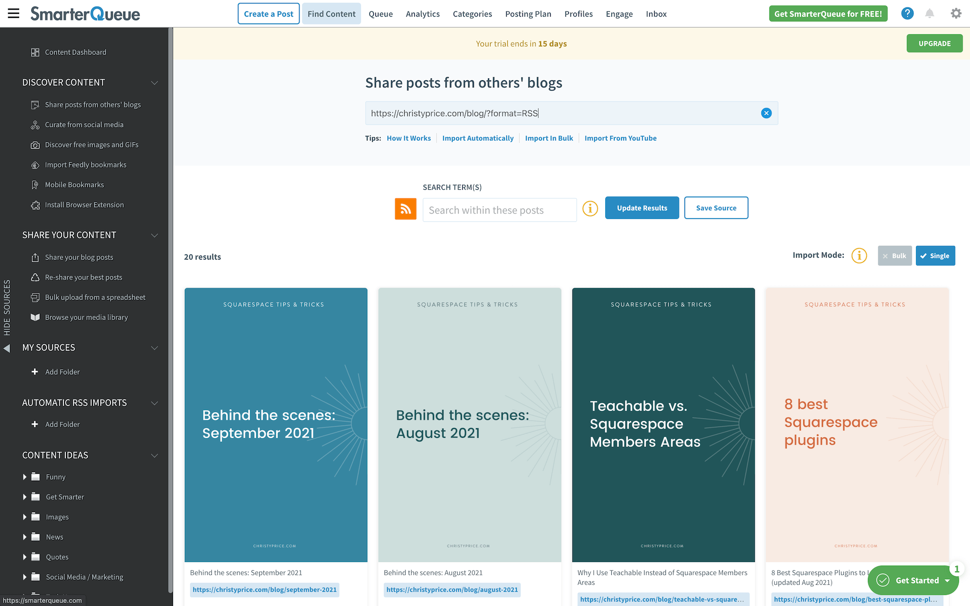SmarterQueue has an amazing tool that helps you find and share content from around the web. You can pull content directly from a website, curate content from social media, find free images, and import Feedly bookmarks.