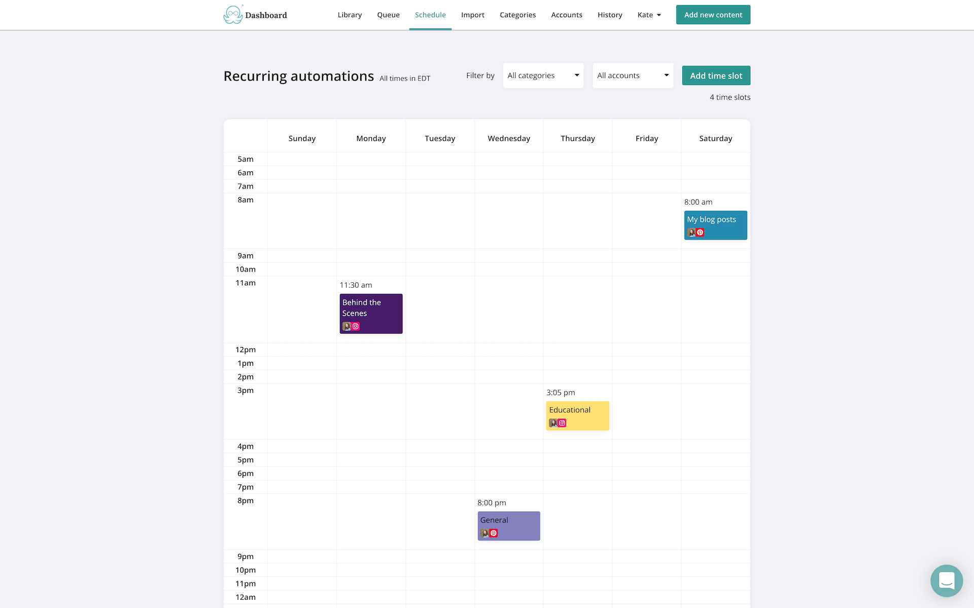You can schedule content to post at a specific time or you can add content to your library. Once you have content in your library, you can set up your automated posting schedule. MeetEdgar will suggest a few optimal posting times but you can completely customize this.