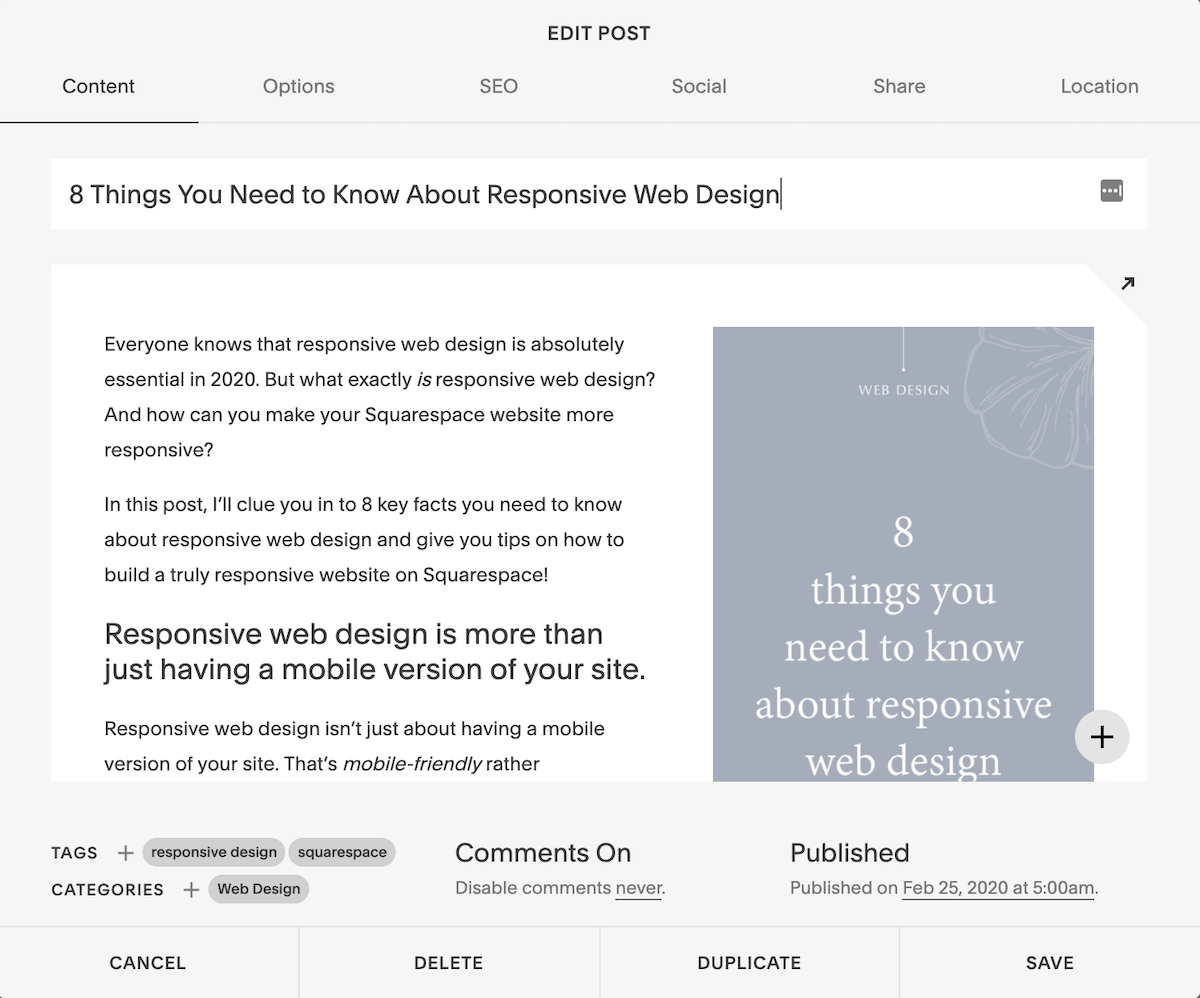 If you format different types of posts differently (for example, posts about podcast episodes vs. posts with YouTube videos or text posts), you can simply create a template for each category. There’s no limit to how many blog post templates you can create in Squarespace!