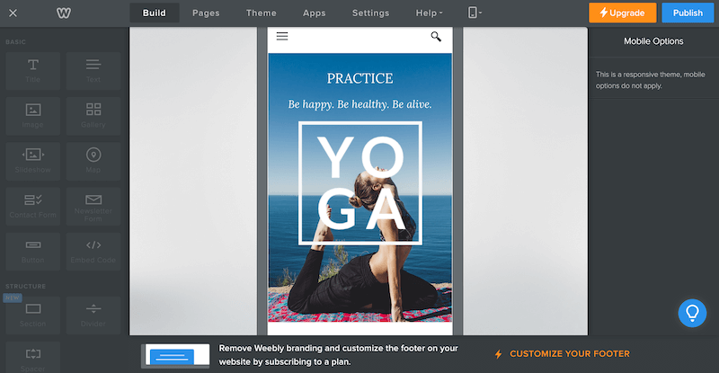 Weebly themes are mobile-responsive too but there are zero mobile customization options. You can use CSS but as we’ll get into in a minute, adding CSS to your website is more difficult with Weebly than it is with Squarespace.